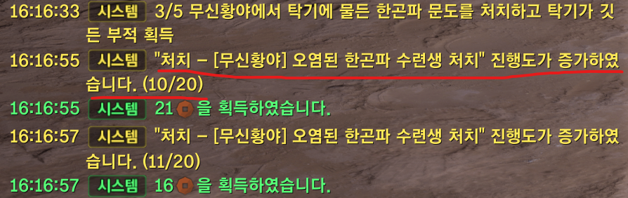 퀘스트를 진행하다보면 처치 진행도가 증가했다는 시스템 알람이 뜨는데, 이건 내실이다.